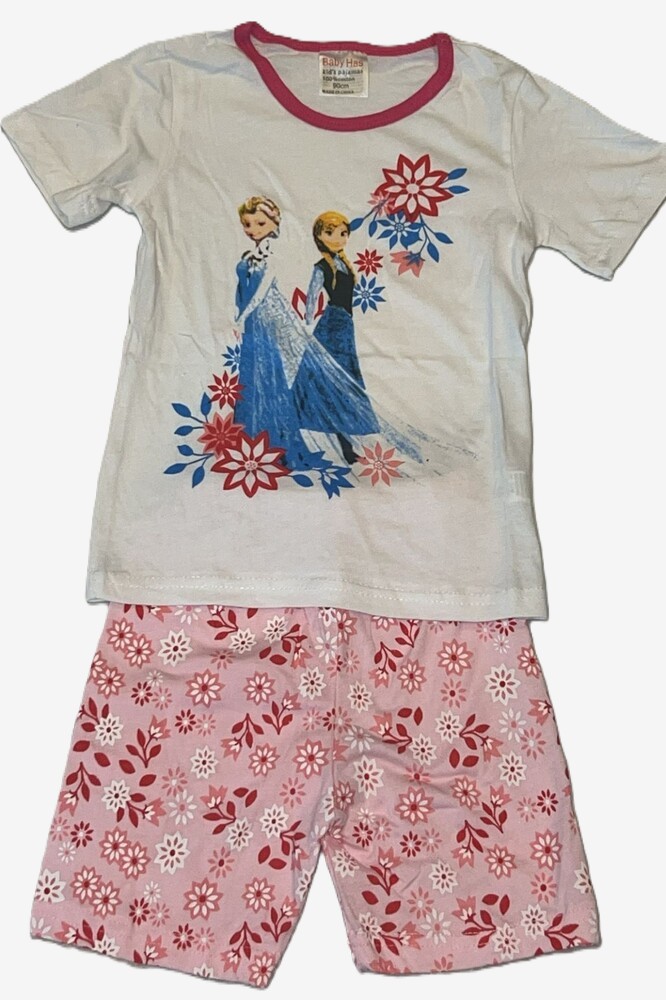Cool and charming, this Frozen short pajama set features Elsa and Anna. The white tee is accented with floral graphics in pink and blue. Matching pink shorts display an all‑over blossom pattern. Soft cotton fabric provides breathable comfort for summer nights. An elastic waistband allows easy movement for active sleepers. Durable prints keep their color wash after wash. A perfect set for Frozen fans.