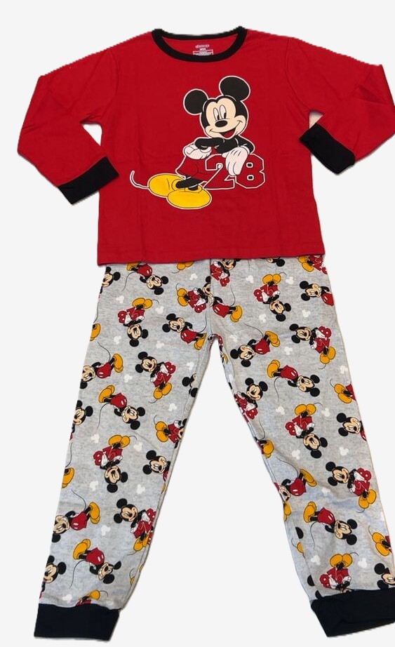 Bring Disney magic to bedtime! This pajama set features a red long‑sleeve top with Mickey Mouse graphic and coordinating grey pants with all‑over Mickey prints. • Soft cotton‑blend knit • Elastic waistband • Ribbed cuffs • Machine washable.