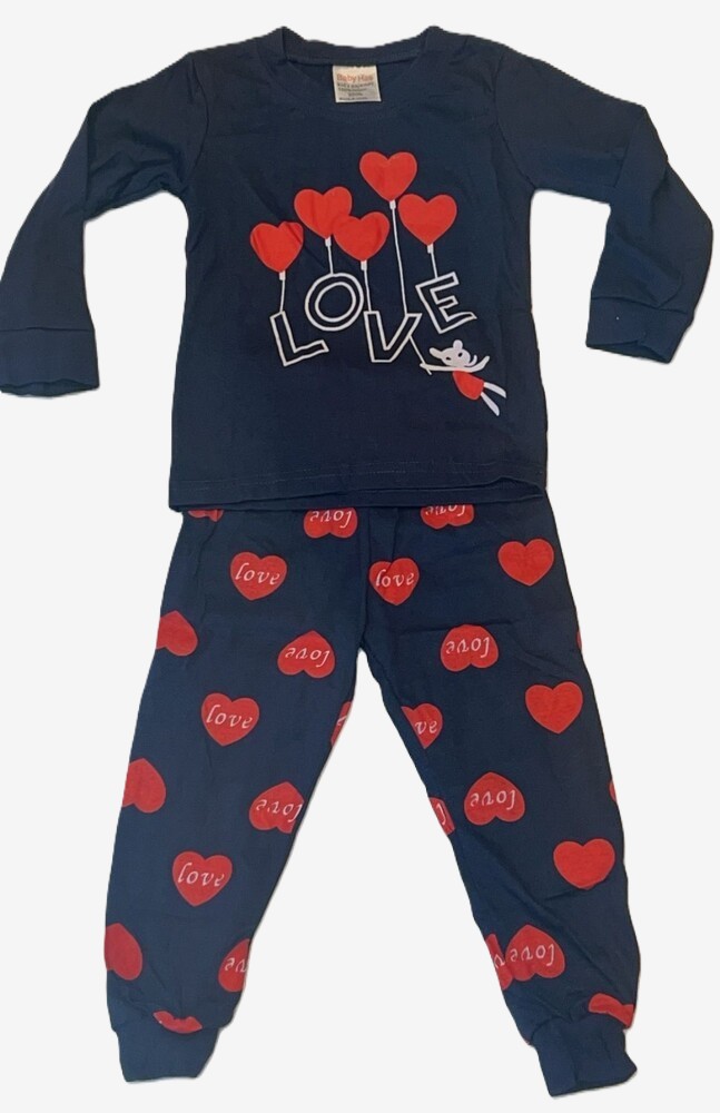 Send hearts soaring with this navy long pajama set. The top features red heart balloons spelling LOVE with a playful character. Matching pants are covered in heart motifs to complete the theme. Cotton knit gives warm yet breathable comfort through the night. Ribbed cuffs keep sleeves and legs in place for sound sleep. Durable construction and colorfast prints last wash after wash. A cozy, cute pick for cool evenings.