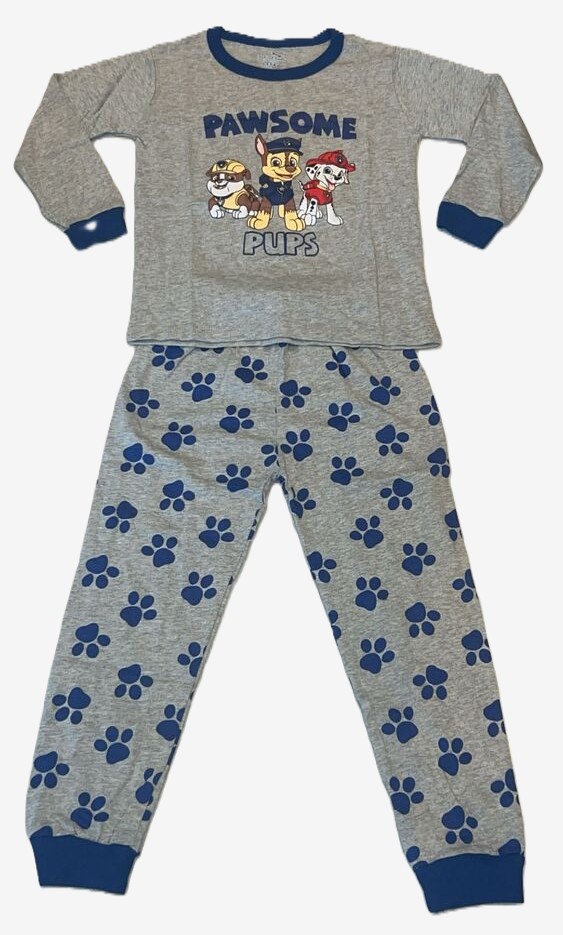 Cuddle up with Chase, Rubble, and Marshall in this long pajama set. The gray top features the Pawsome Pups graphic for big smiles. Cozy pants show all‑over paw prints to complete the look. Cotton knit provides warm yet breathable comfort overnight. Ribbed cuffs keep sleeves and legs in place for sound sleep. Durable fabric maintains its shape and color wash after wash. Ideal for Paw Patrol fans of all ages.