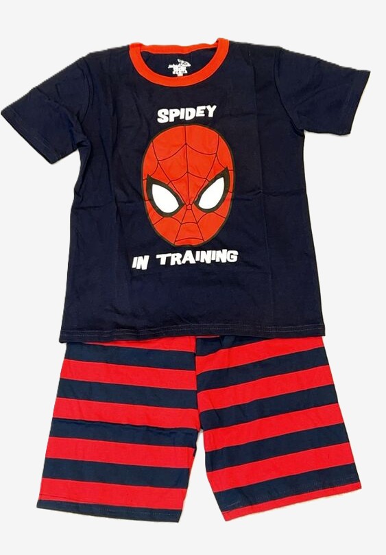 Swing into comfort with Spider‑Man! This pajama set includes a navy short‑sleeve tee with ‘Spidey in Training’ graphic and red‑and‑navy striped shorts. • Soft cotton blend • Elastic waistband • Machine washable.